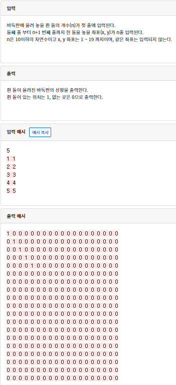 19*19 크기의 바둑판에 돌을 둔다 할 때, 돌이 올려진 바둑판의 상황을 출력하는 것이 목적이다. 돌이 있는 위치는 1, 없는 곳은 0으로 출력한다. 또한 입력 값은 첫 번째는 돌의 개수, 두 번째 부터는 그 돌이 둬진 좌표를 입력 받는다.(줄단위로)