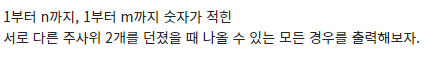 중첩 for문을 사용해서 풀었다. 주사위 2개를 던졌을 때 나올 수 있는 모든 경우의 수를 구해야 하므로, for문 2개의 range 범위를 각각 1부터 첫번째 입력 값 + 1, 1부터 두번째 입력 값 + 2로 정하면 된다.