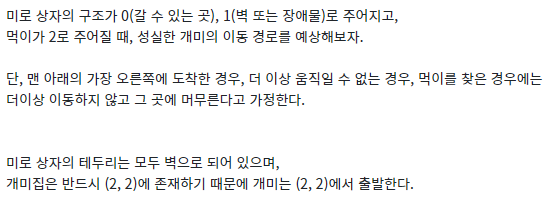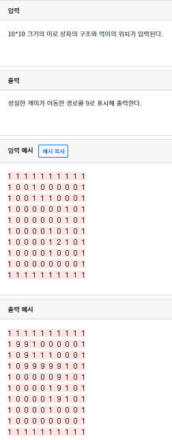 미로 구조가 입력으로 주어지고, 0은 갈 수 있는 곳, 1은 벽, 2는 먹이(목적)을 의미한다. 개미는 2,2(리스트 기준 1,1)에서 이동을 시작하고 오른쪽으로만 움직이다가 벽을 만나면 아래쪽으로 움직인다한다. 이동경로를 9로 나타내고 먹이를 먹는다면 더 이상 이동 X, 맨 아래, 맨 오른쪽에 도착했을 때도 이동을 안한다고 한다. 이동 경로를 미로 구조에 나타내 출력하는 것이 목적이다.
