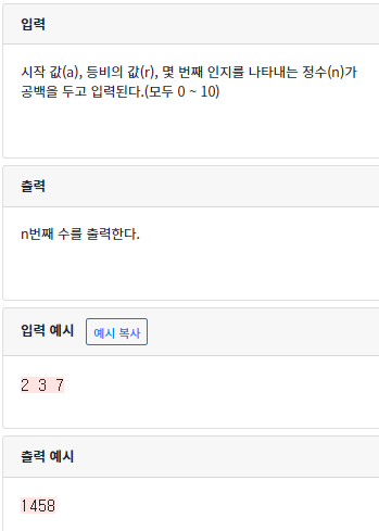 1089번 문제와 조금 다르게 이번에는 입력 값이 시작 값, 등비 값, (몇) 번째 값이 입력된다. 등비 만큼 곱해줘서 해당 번째 값이 되면 그 값을 출력하는 것이 목적이다.