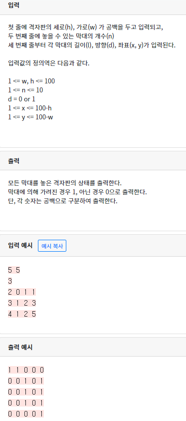 막대에 의해 가려진 부분을 1, 아닌 부분은 0으로 격자판을 출력하는 것이 목적이다.