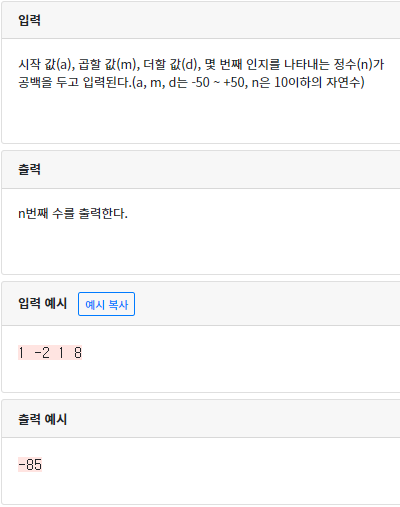 1089, 1090을 합친듯한 문제로 이번에는 4개의 값이 주어진다. 각각 시작 값, 등비(곱할) 값, 등차(더할) 값, (몇) 번째 값이 입력된다. 위에 사진에는 안나와 있지만 순서는 곱하고 더하는 순으로 진행된다. 해당 번째의 값을 출력하는 것이 목적이다.