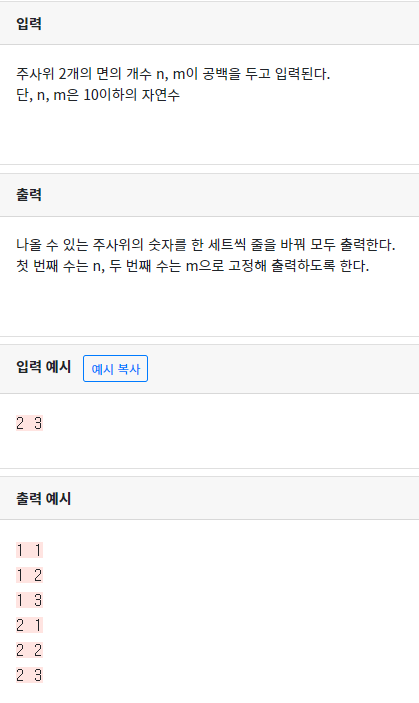 주어진 값까지의 숫자가 적힌 주사위를 던졌을 때 나올 수 있는 모든 경우를 구해서 출력하는 것이 목적이다.