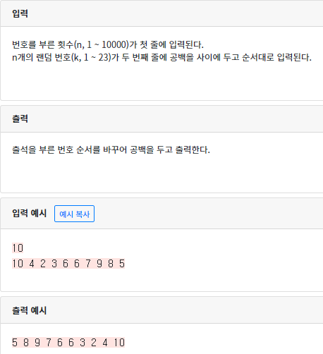 첫 번째 줄에는 출석을 부른 횟수(저장할 리스트의 크기), 두 번째 줄에는 횟수만큼의 1~23 사이의 값들이 입력된다. 두 번째 줄에서 입력된 값을 거꾸로 뒤집어서 출력하는 것이 목적이다.