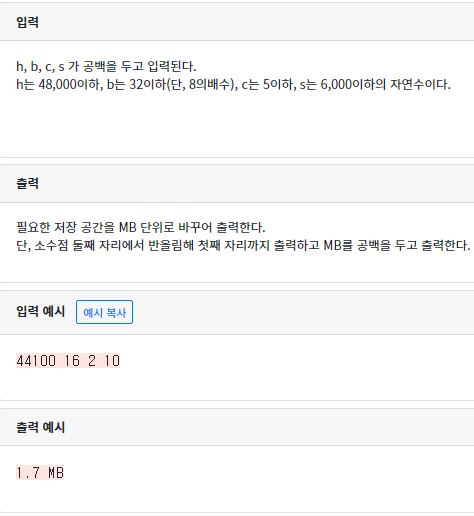 4 값이 주어지는데 이 값들을 곱한 후 MB 단위로 출력하는 것이 목적이다.
