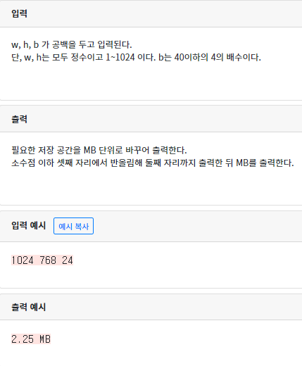 1085 문제와 비슷하게 3 값이 주어지고 3값의 곱을 MB 단위로 나타내는 것이 목적이다.