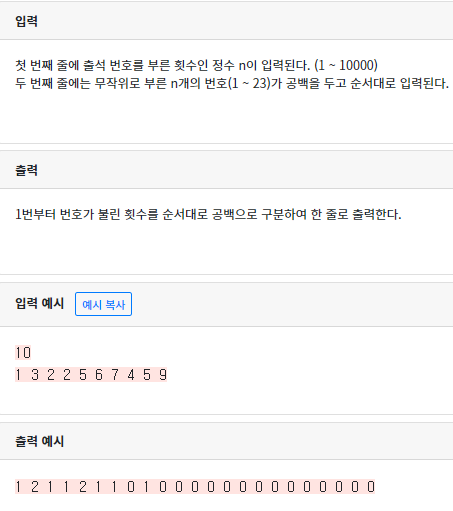 첫 번째 줄에는 출석을 부른 횟수(저장할 리스트의 크기), 두 번째 줄에는 횟수만큼의 1~23 사이의 값들이 입력된다. 1부터 23까지 각 값이 두 번째 줄에서 몇번 입력됐는지를 구하는 것이 목적이다.