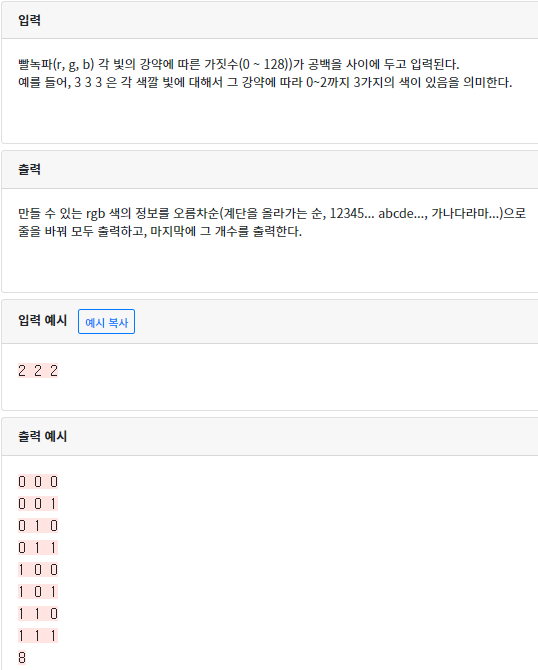 1081번 문제와 비슷한 문제로 값이 3개로 늘었다는 점만 다르다. 1081번 원리와 동일하므로 간단히 정리하겠다. 이번 문제도 역시 for문을 3개 만들어서 각각 rgb에 해당되는 모든 경우의 수가 출력되도록 했다.