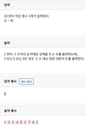1부터 입력된 정수까지 공백으로 간격으로 주어 출력하는데, 해당 값이 3, 6, 9인 경우 'X'를 대신 출력하는 것이 목적이다.