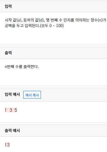 세 값이 입력되는데, 첫 번째 값은 시작 값, 두 번째 값은 등차(증가폭)의 값, 마지막 값은 몇 번째인지를 의미하는 값이다. 즉 시작 값부터 등차 값으로 수를 증가시키는데, 그 중 마지막으로 입력되는 값 번째에 해당하는 수를 출력하는 것이다.