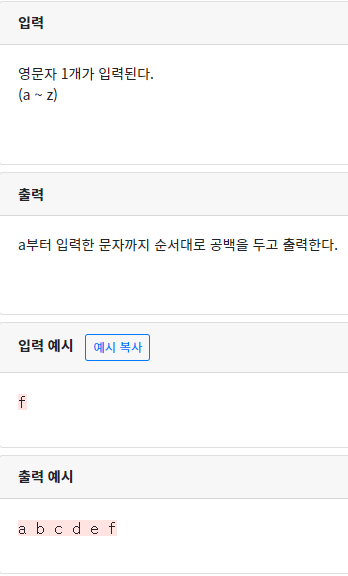 입력 된 알파벳까지 알파벳 순서대로 출력하는 것이 목적이다.