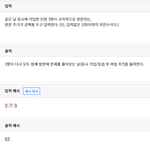 입력 된 세 값의 최소 공배수를 구하는 것이 목적이다.