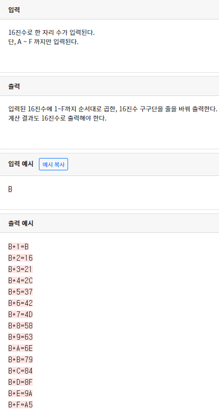 처음에는 쉬울줄 알았으나 출력 결과를 보면 16진수 a,b,c,d,e,f는 모두 대문자로 출력된다. for문으로 16진수이므로 1~15까지 값을 i에 받아오고 연산을 수행했다. 파이썬에서 hex나 %x를 쓸 경우 소문자로 출력되기 때문에 str, hex하고 문자열로 변환된 값에 upper로 대문자로 만들어 주었다.