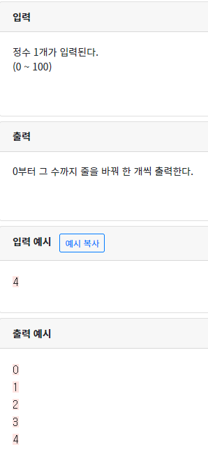 0부터 입력 된 값까지 1씩 증가하면서 값을 하나씩 출력하는 것이 목적이다.