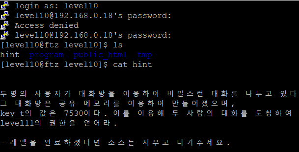 Level9에서 얻은 패스워드를 이용해 level10으로 로그인하면 hint 파일과 program 디렉터리가 존재한다. hint 파일을 cat 명령어로 읽어보니 공유 메모리(key_t : 7530)를 이용해 두 명의 사용자가 대화를 나누고 있는데, 주어진 키 값을 이용해 대화를 도청한 후 권한을 얻는 것이 목적이다.