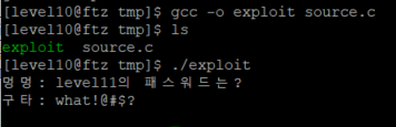 작성한 소스 코드를 gcc로 빌드한 후 실행하니 level11의 패스워드를 얻을 수 있었다.