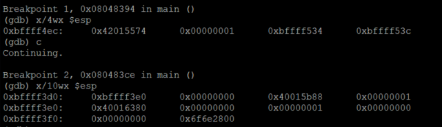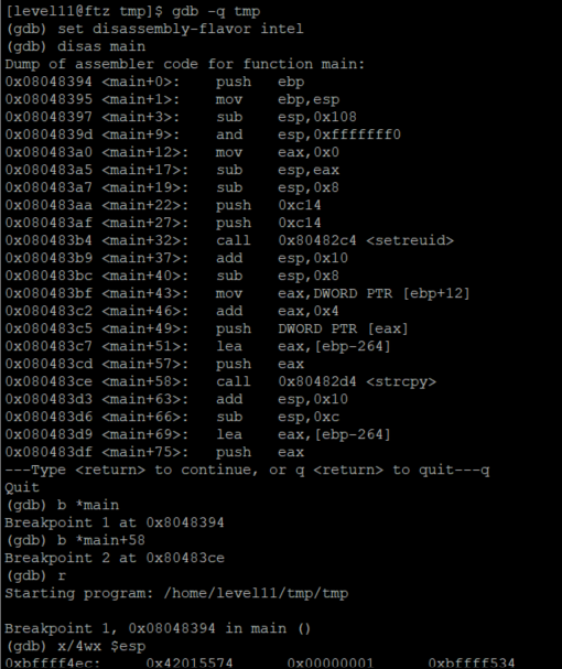ret의 스택 위치, str의 위치를 확인하기 위해서 gdb로 열고 bp를 걸어줬다.