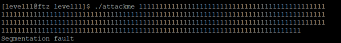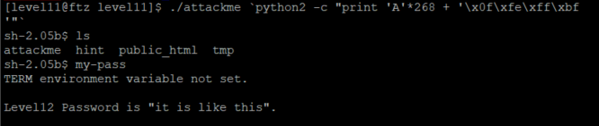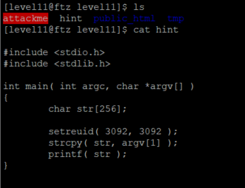 level 10에서 얻은 패스워드로 로그인한다면 setuid가 걸려있는 attackme 파일과 hint 파일을 볼 수 있다.