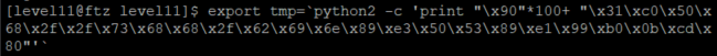 tmp라는 환경변수 안에 쉘 코드를 삽입했다. 그냥 쉘 코드만 넣었을 때는 제대로 exploit이 되지 않아 앞에 \x90을 조금 넣어줬다.