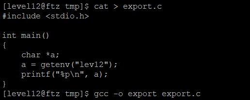 환경변수의 주소를 알아내야하므로 getenv를 이용해 lev12 환경변수의 주소를 구해주는 코드를 작성하고 빌드했다.