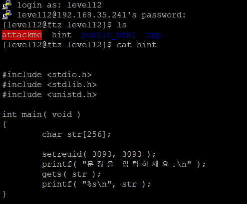 level11과 비슷하게 로그인 후 ls 명령어를 통해 파일 들을 확인해보면 setuid가 걸린 파일 attackme와 hint가 존재하는 것을 알 수 있다. hint에는 attackme의 소스코드가 들어있다.