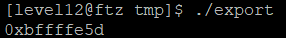 위의 소스코드로 빌드된 프로그램을 실행해보면 lev12 환경변수의 주소가 0xbffffe5d인 것을 알 수 있다.