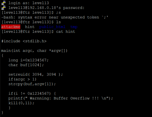 level13으로 로그인 후 hint 파일을 확인해보면 마찬가지로 소스코드가 주어진다. 확인해보면 인자 값을 1024 크기의 char형 배열 buf로 strcpy 함수를 이용해 복사하는데, 문제는 strcpy 함수가 bof에 취약한 함수라는 것이다.