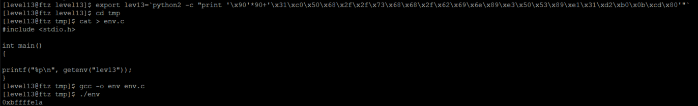 환경 변수 lev13에 혹시 몰라 \x90과 함께 쉘 코드를 삽입해줬고 환경 변수의 주소를 구하는 코드를 작성한 후 빌드해 주소도 구했다.