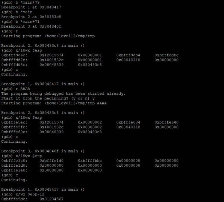 main의 함수 프롤로그, strcpy, cmp(i 값 check) 부분에 bp를 걸고 실행한 후 스택을 확인한다면 각각의 주소를 구할 수 있다.