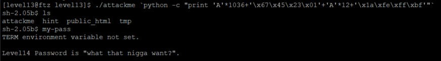 그렇다면 payload는 dummy*1036 + "\x67\x45\x23\x01" + dummy*12로 구성한다면 검증 로직에 걸리지 않고 ret에 접근할 수 있다.